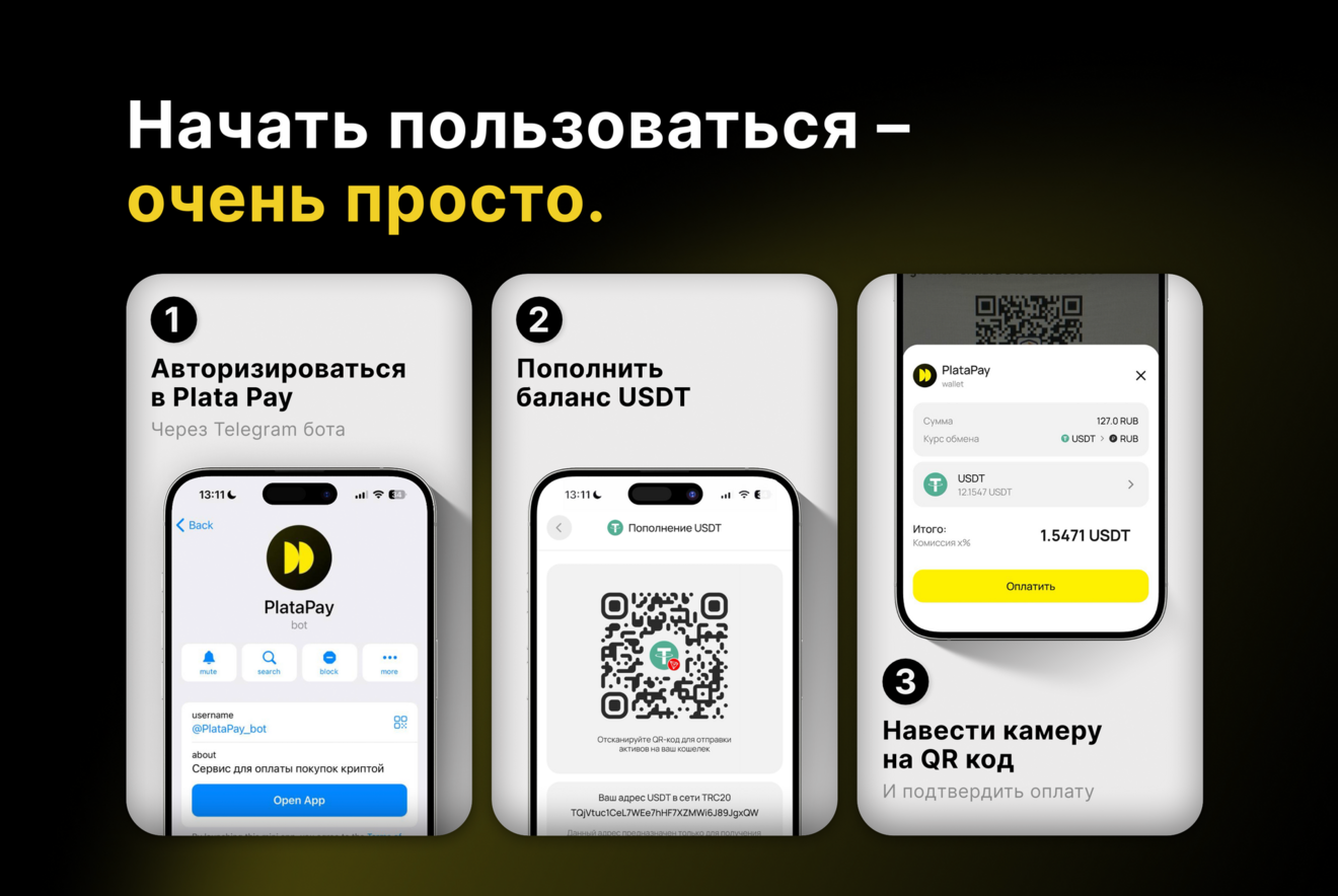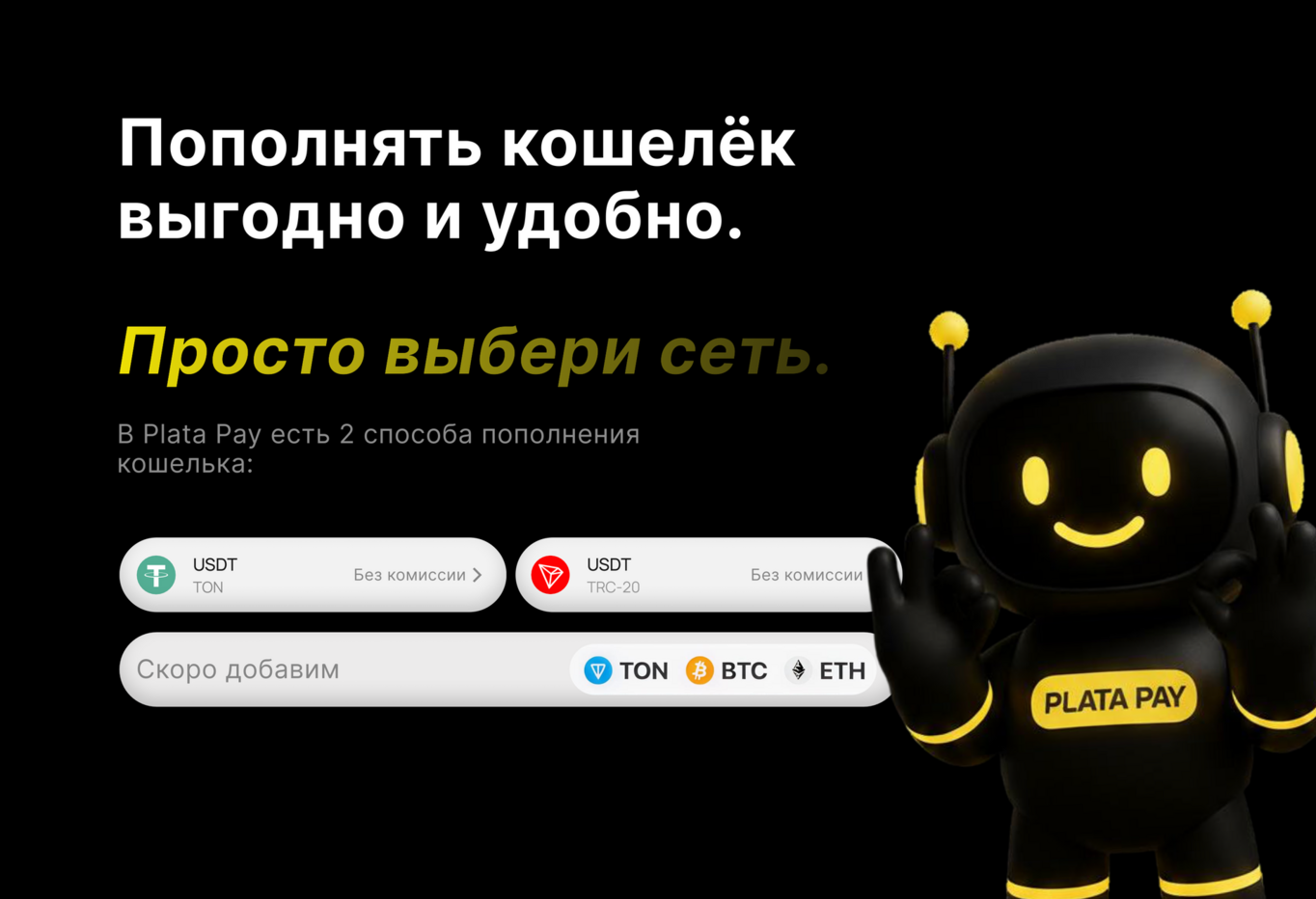 Чтобы пополнить баланс: Нажмите кнопку «Пополнить» на основной странице приложения Выберите способ пополнения «Внешний кошелёк». Выберите доступные для пополнения криптовалюты и подходящую вам сеть Переведите выбранную криптовалюту на указанный адрес депозита на сумму больше 5 USDT Баланс обновится моментально. На данный момент доступно пополнение только через внешний кошелёк в токенах USDT и сетях TRC20 . Мы активно работаем над новыми способами, токенами и сетями.